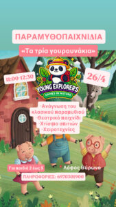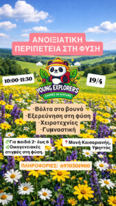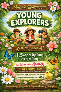 Η αγάπη μου για τα παιδιά και τη φύση με οδήγησε στη δημιουργία των Young Explorers, μιας ομάδας όπου μικροί και μεγάλοι εξερευνούμε, παίζουμε και μαθαίνουμε μαζί μέσα στο φυσικό περιβάλλον.